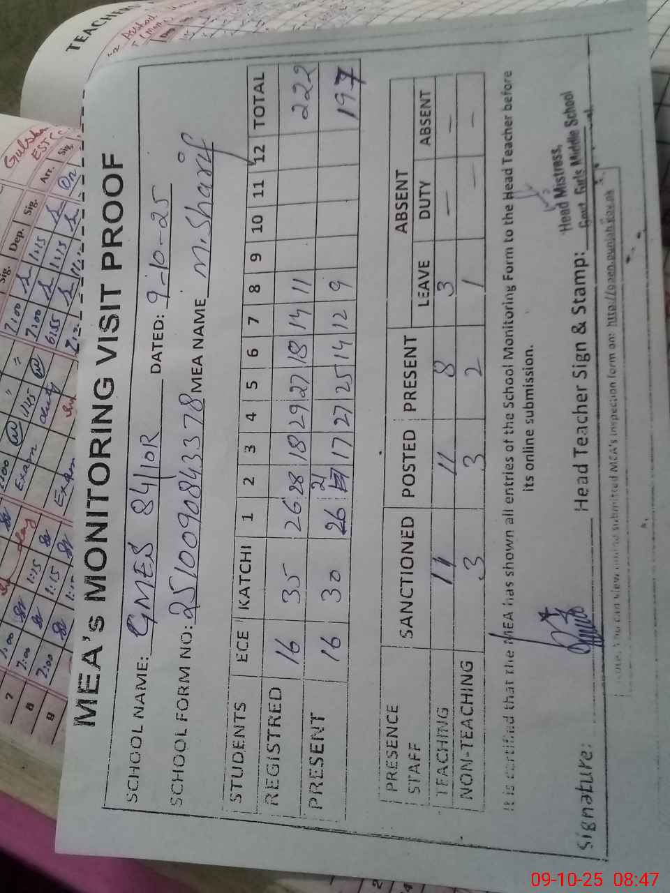 | Certified that this School was Inspected by the Undersigned MEA/DMO Today and the Information Stated Above is as Per Record. | |||||