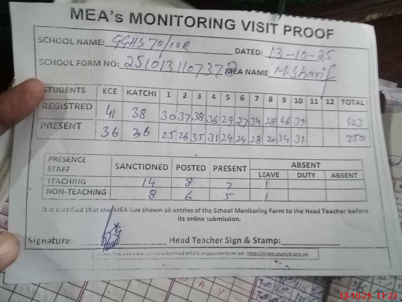 | Attendance Register | Head Teacher | MEA with School | Visit Proof |