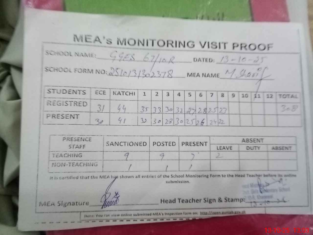 | Attendance Register | Head Teacher | MEA with School | Visit Proof |