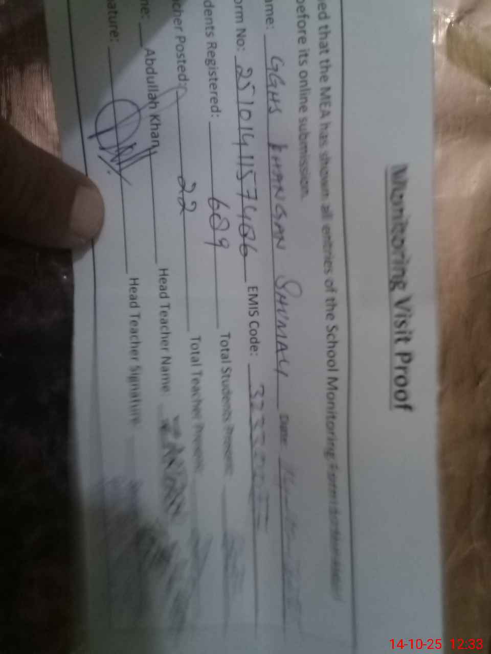 | Name: SY**** NA**** BA**** Designation: (School Headmaster's/Headmistress's) HEADMASTER Phone/Cell Number: 03**** |