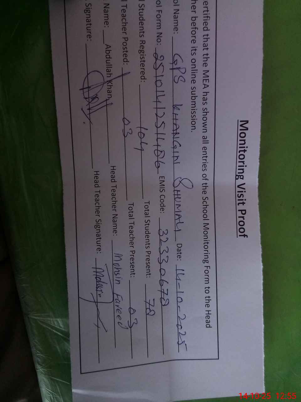 | Attendance Register | Head Teacher | MEA with School | Visit Proof |