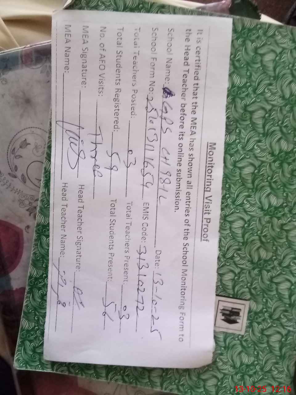 | Attendance Register | Head Teacher | MEA with School | Visit Proof |