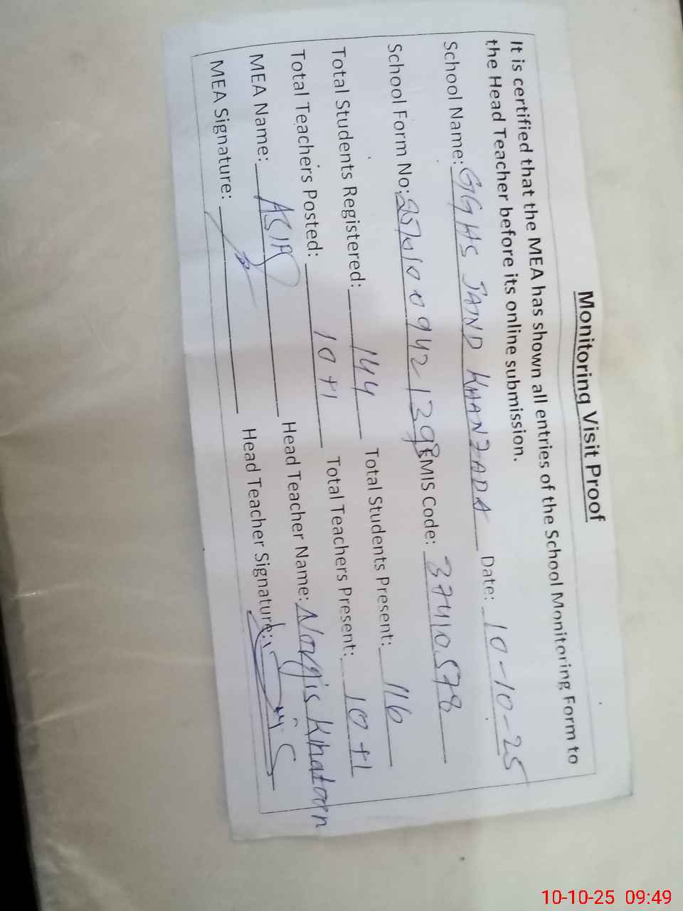 | Certified that this School was Inspected by the Undersigned MEA/DMO Today and the Information Stated Above is as Per Record. | |||||