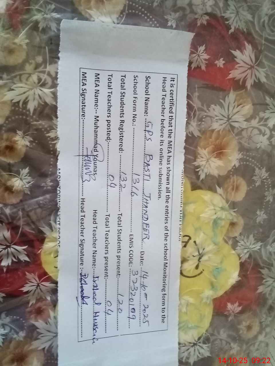 | EMIS Code: 32320109 | Name of School: GPS BASTI JHANDEER | |||