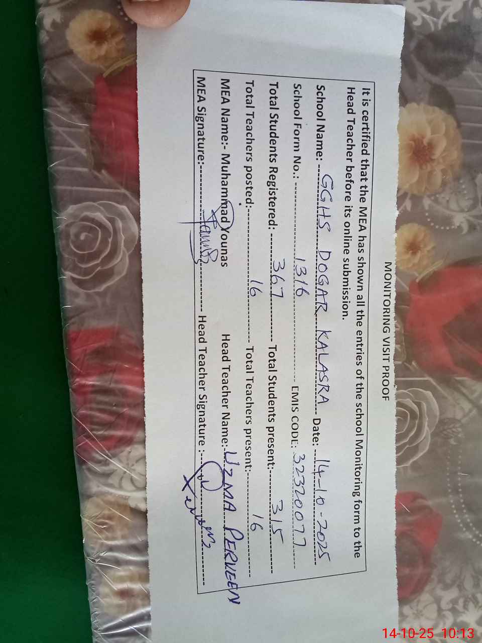 | Certified that this School was Inspected by the Undersigned MEA/DMO Today and the Information Stated Above is as Per Record. | |||||