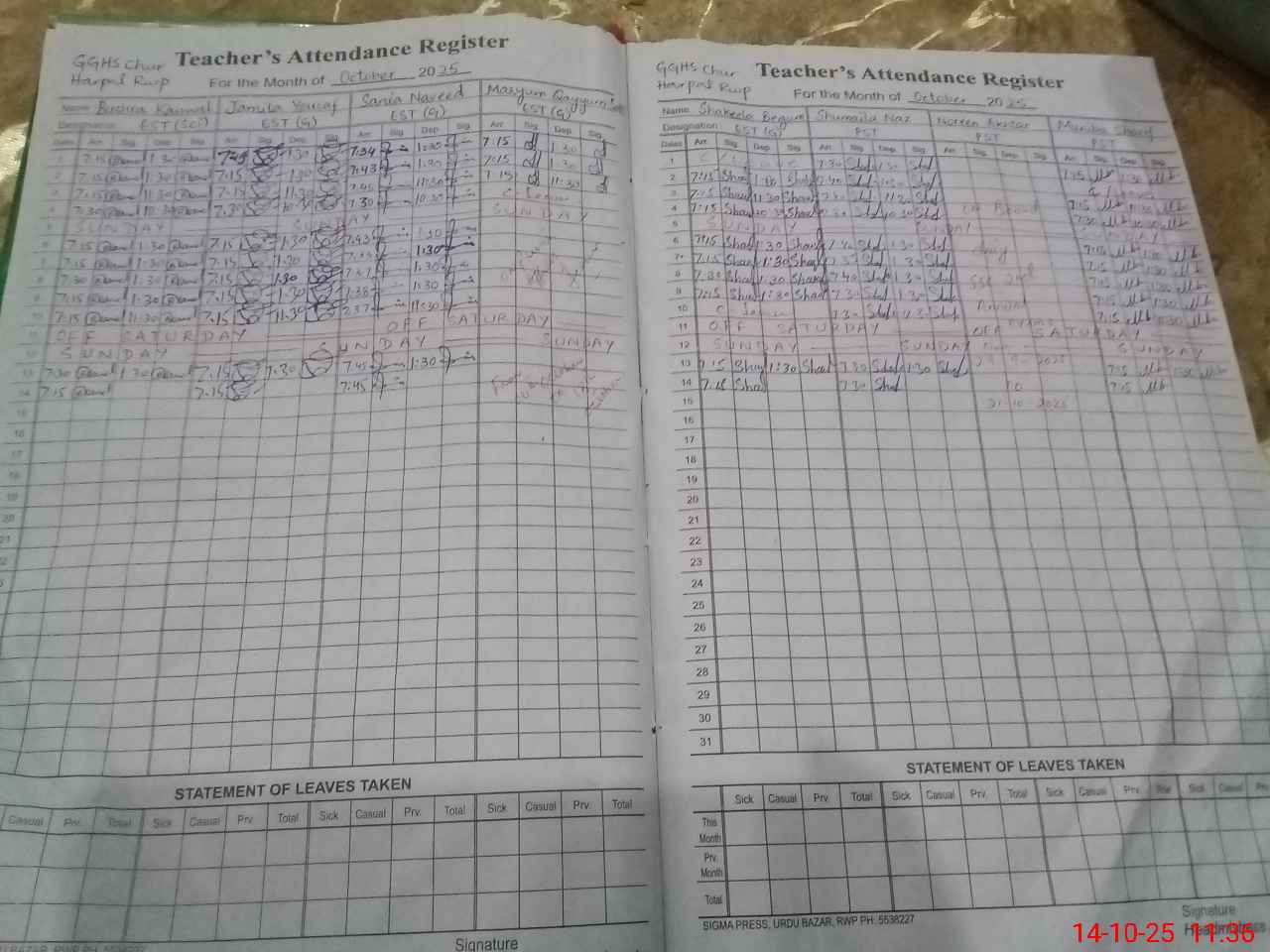 | 37**** | Fa**** Ma**** | PST | Regular | 0 | 0 | 0 | 0 | 0 | 0 | 0 | 0 | 0 | Exam Duty |