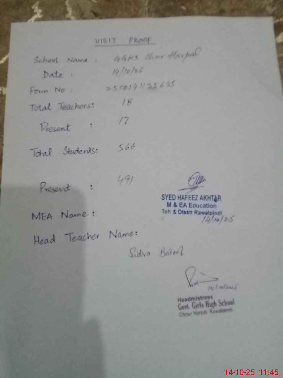 | Attendance Register | Head Teacher | MEA with School | Visit Proof |