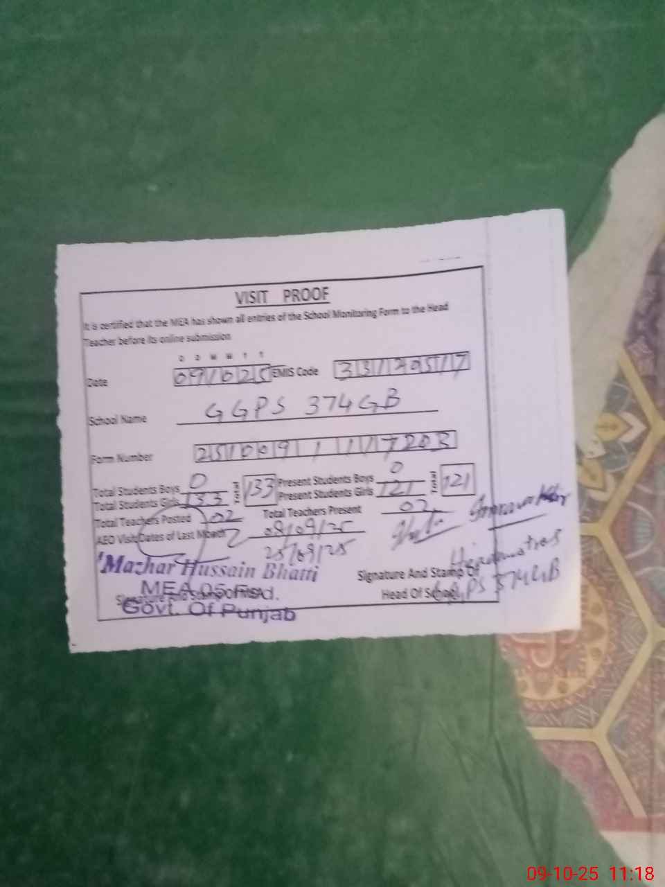| EMIS Code: 33120517 | Name of School: GGES CHAK 374 GB SATIANA | |||