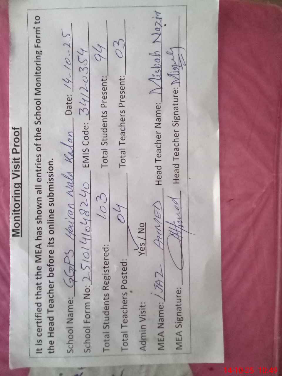 | Certified that this School was Inspected by the Undersigned MEA/DMO Today and the Information Stated Above is as Per Record. | |||||