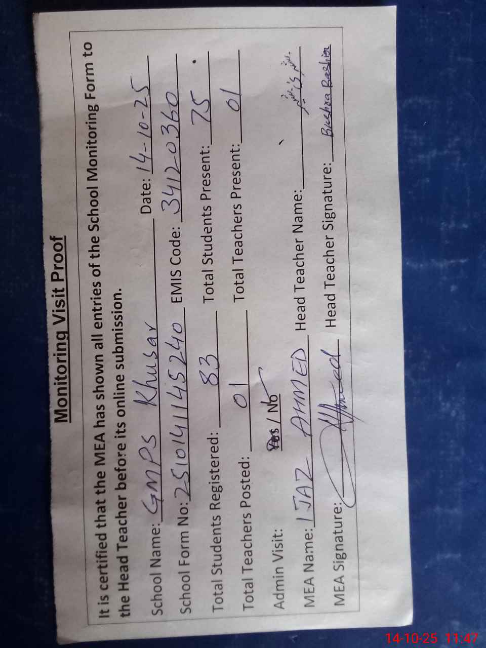 | EMIS Code: 34120360 | Name of School: GMPS KHUSAR | |||
