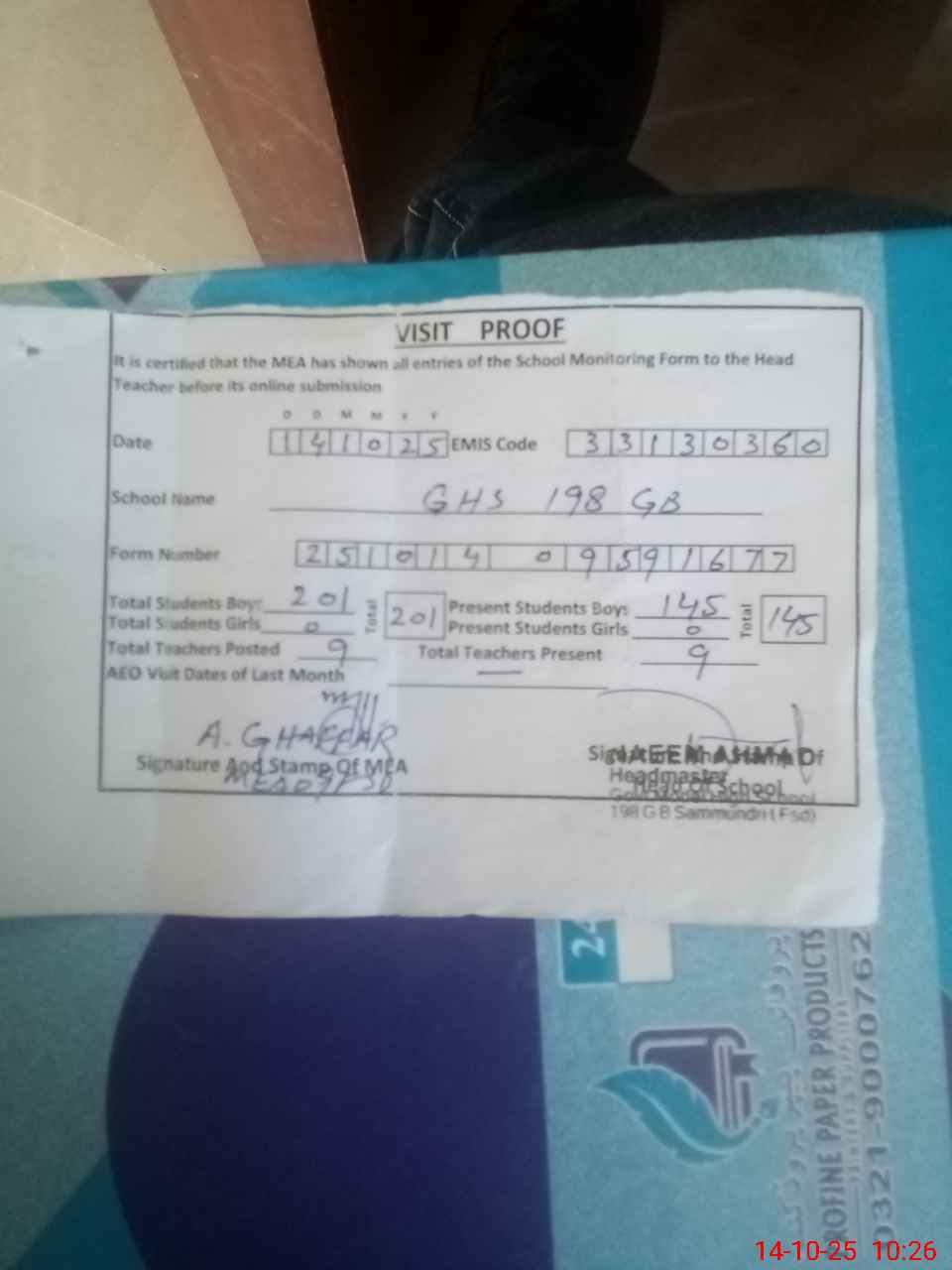 | Attendance Register | Head Teacher | MEA with School | Visit Proof |