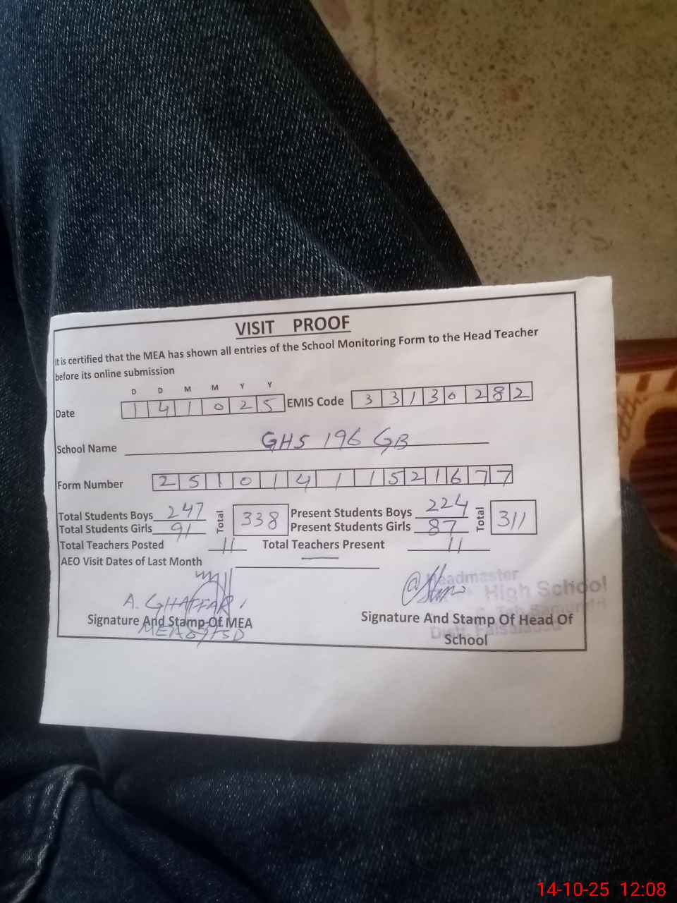 | Attendance Register | Head Teacher | MEA with School | Visit Proof |