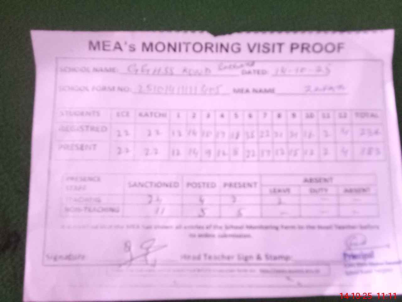 | Attendance Register | Head Teacher | MEA with School | Visit Proof |