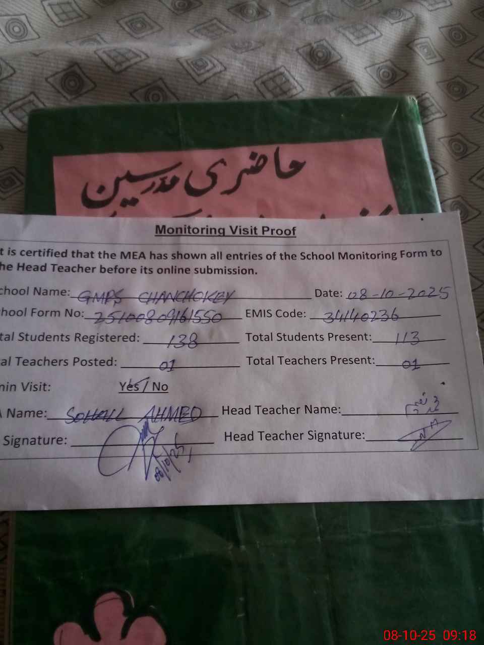 | Attendance Register | Head Teacher | MEA with School | Visit Proof |