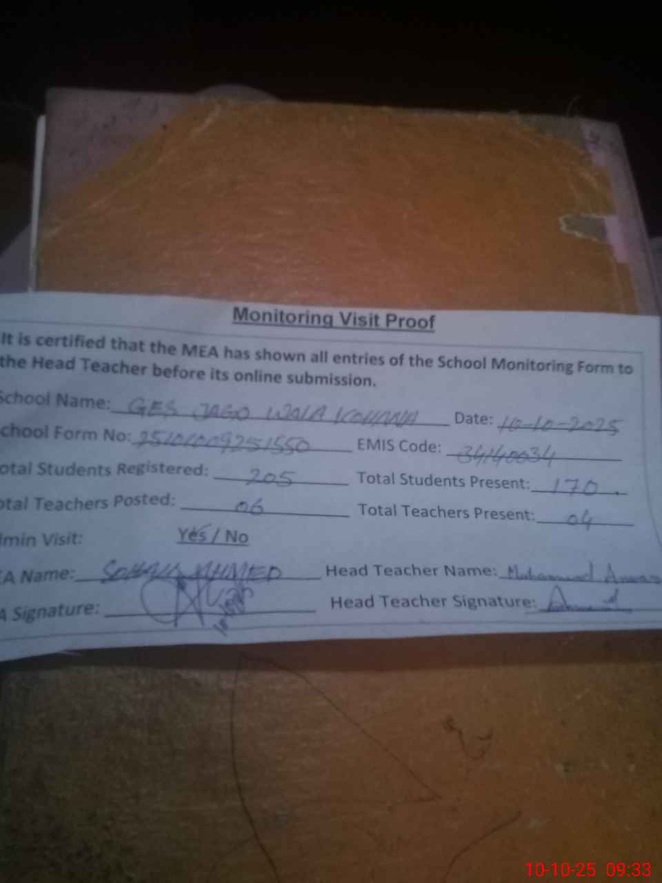| Attendance Register | Head Teacher | MEA with School | Visit Proof |
