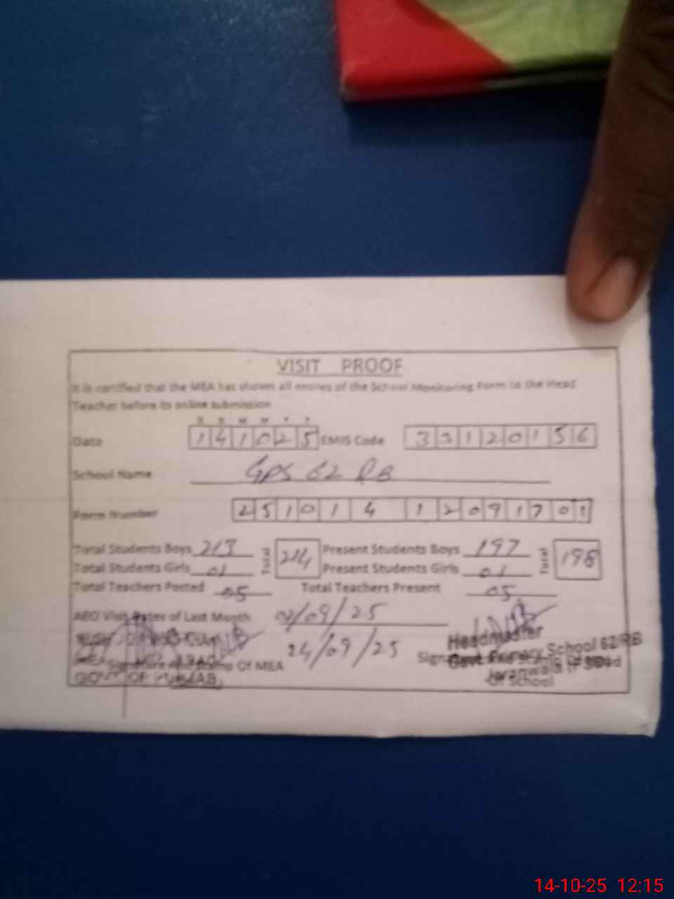 | EMIS Code: 33120156 | Name of School: GPS 62 RB | |||