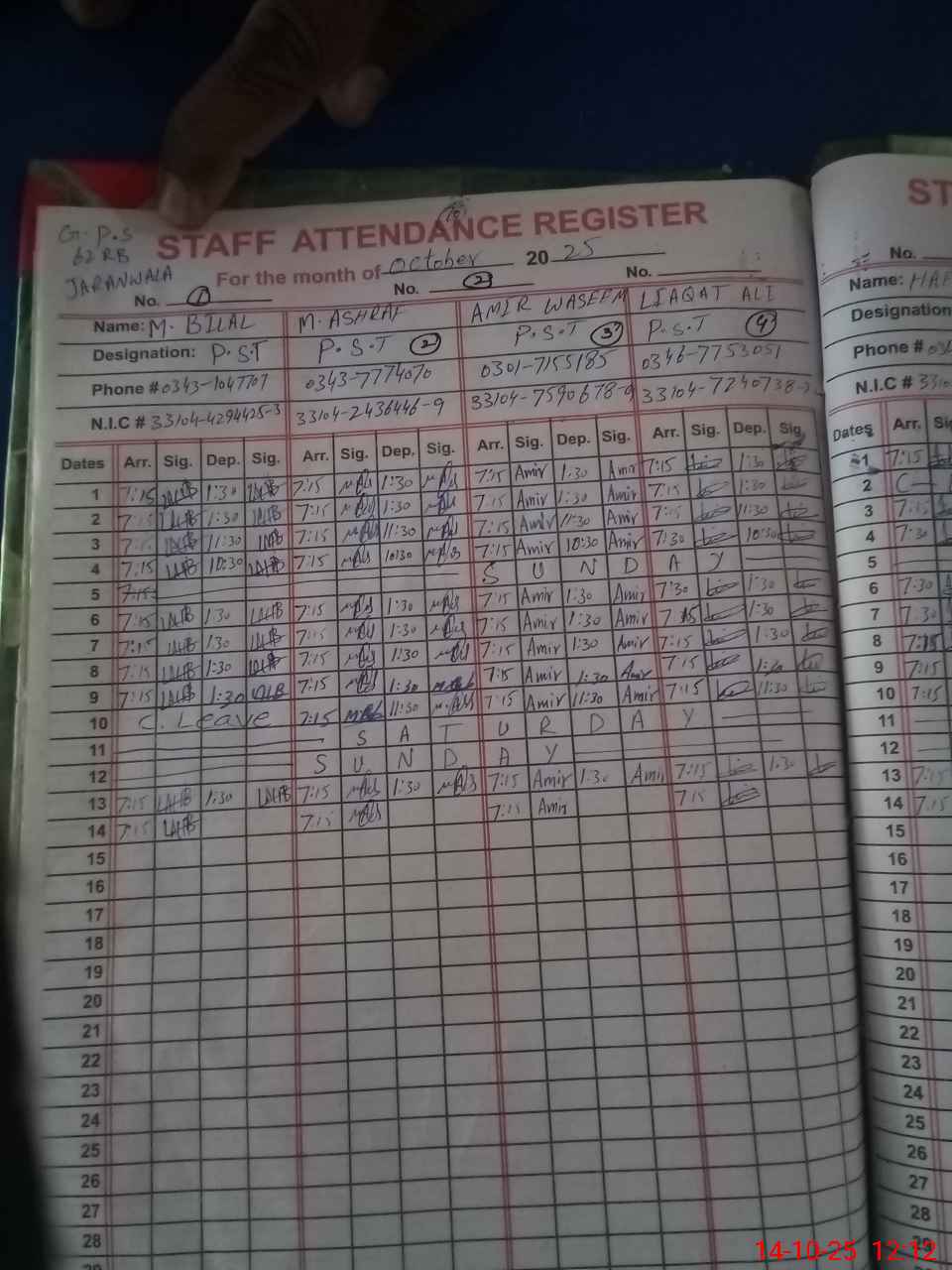 | CNIC | Full Name | Designation | R/C | Absence during last cal. month |