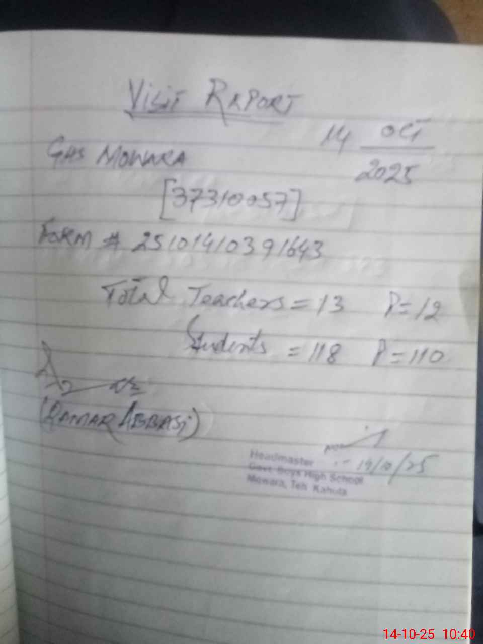 | Attendance Register | Head Teacher | MEA with School | Visit Proof |