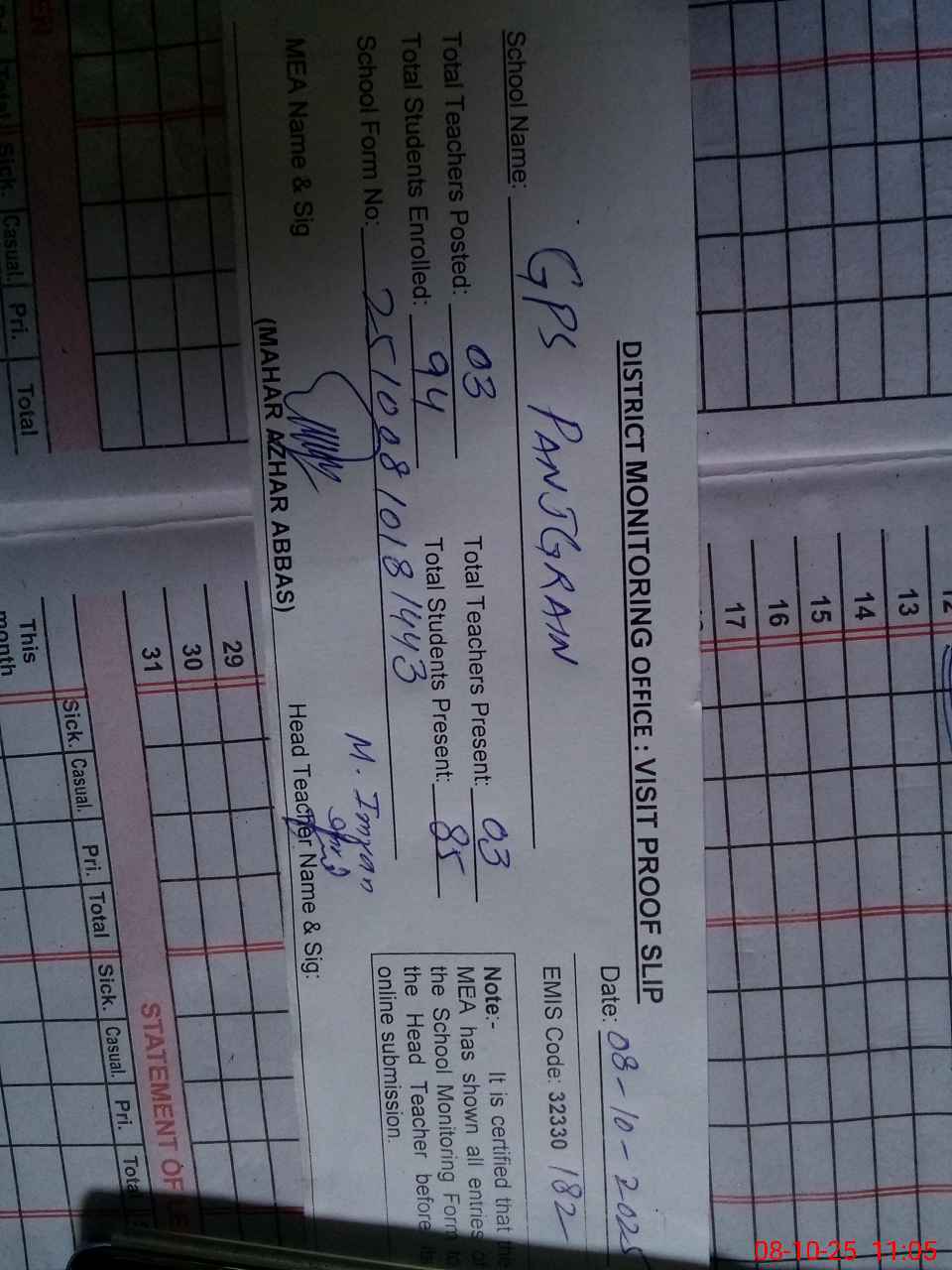 | EMIS Code: 32330182 | Name of School: GPS PANJGRAIN | |||