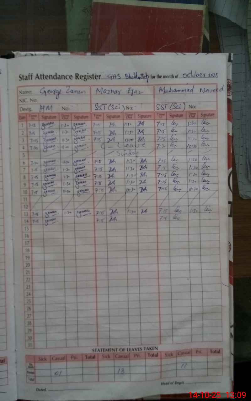 | CNIC | Full Name | Designation | R/C | Absence During Last Calender Month |