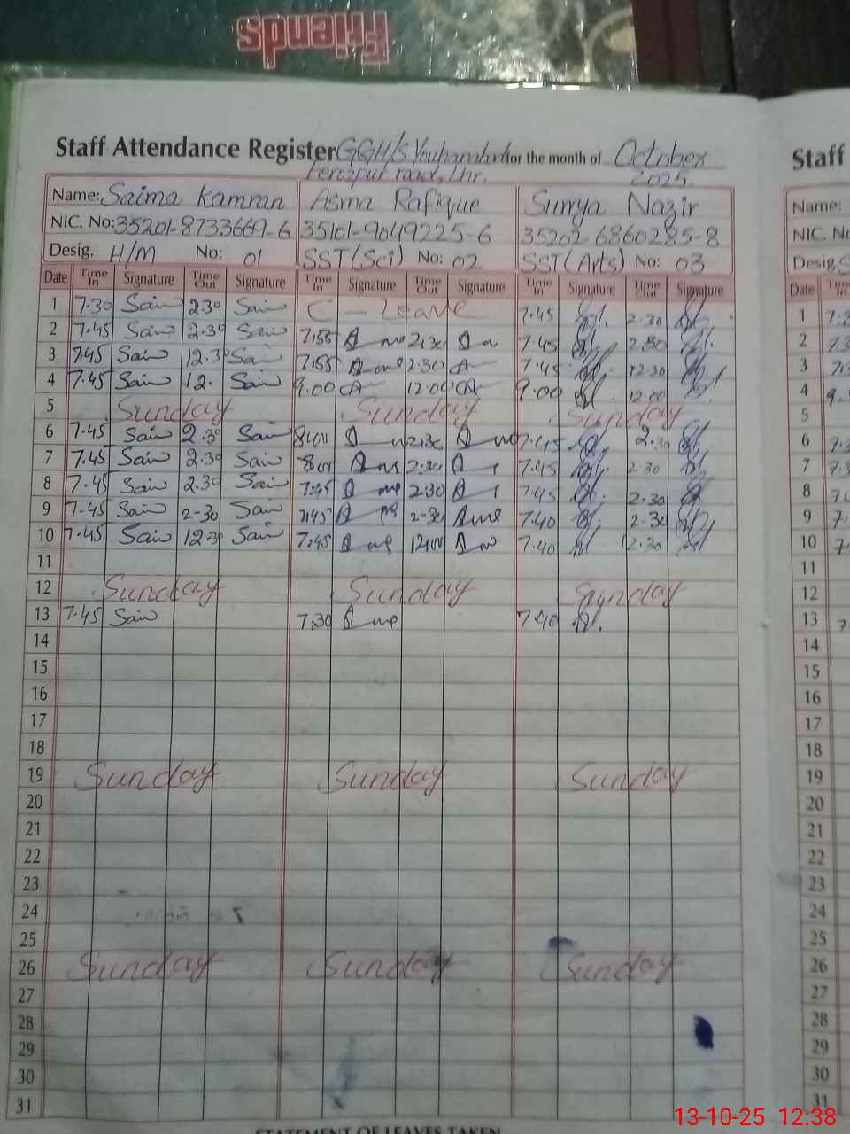 | CNIC | Full Name | Designation | R/C | Absence During Last Calender Month |