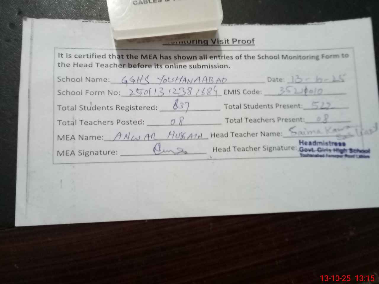 | Attendance Register | Head Teacher | MEA with School | Visit Proof |