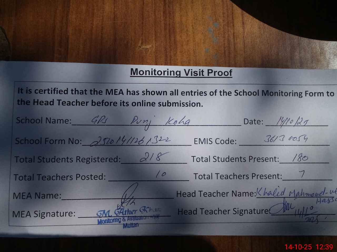 | EMIS Code: 36130054 | Name of School: GHS PUNJ KOHA MULTAN | |||