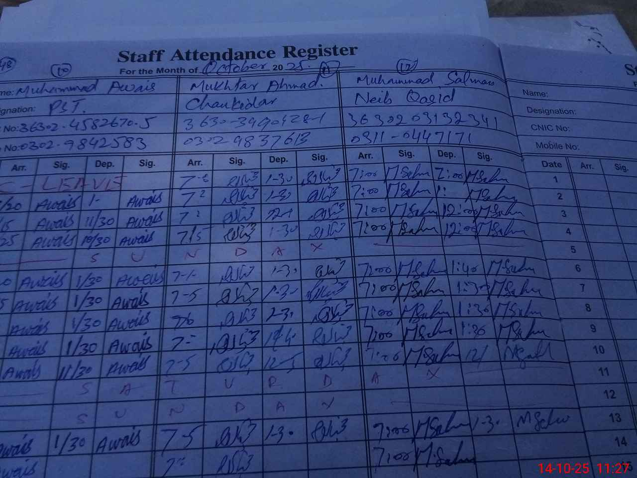 | CNIC | Full Name | Designation | R/C | Absence During Last Calender Month |