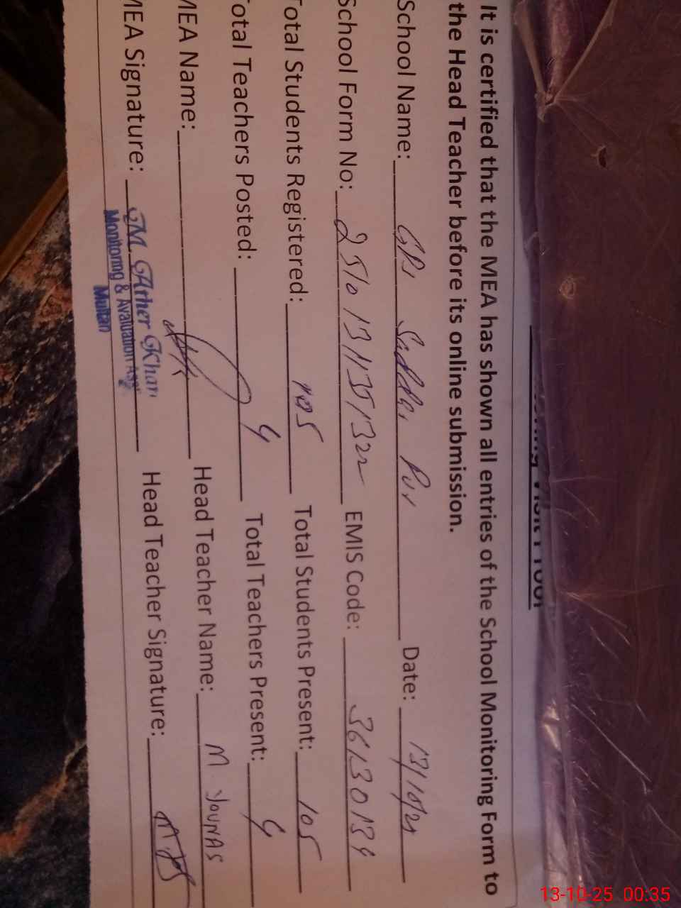 | Certified that this School was Inspected by the Undersigned MEA/DMO Today and the Information Stated Above is as Per Record. | |||||