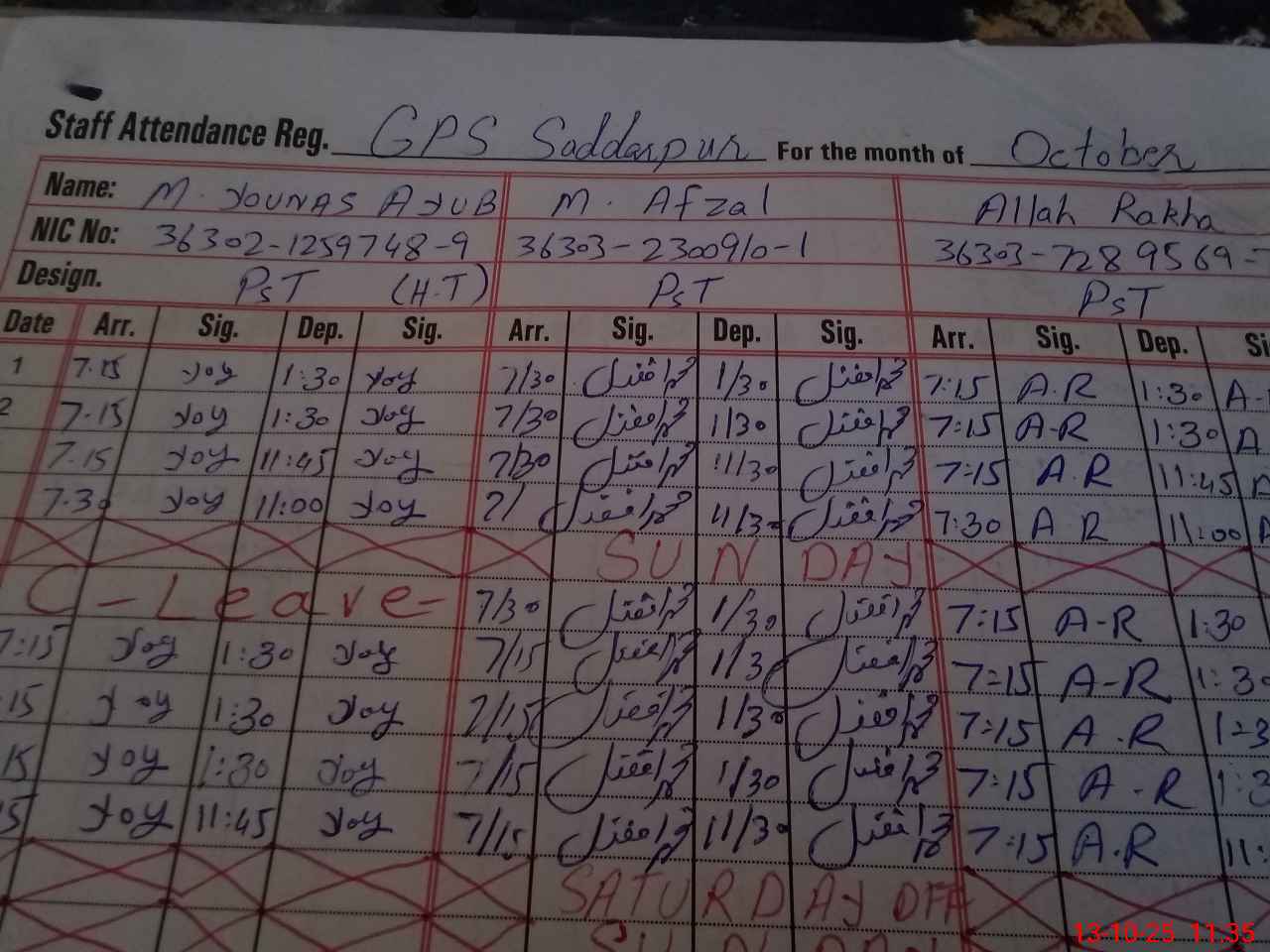 | CNIC | Full Name | Designation | R/C | Absence During Last Calender Month |