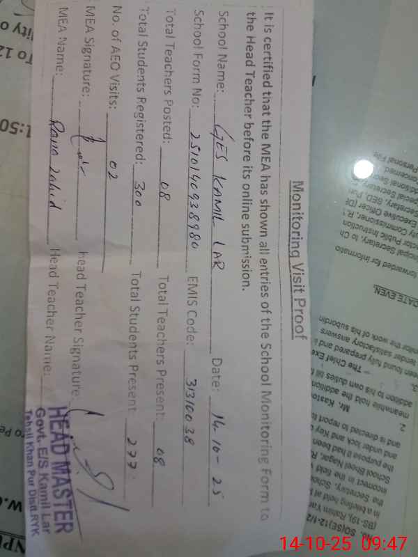 | Certified that this School was Inspected by the Undersigned MEA/DMO Today and the Information Stated Above is as Per Record. | |||||