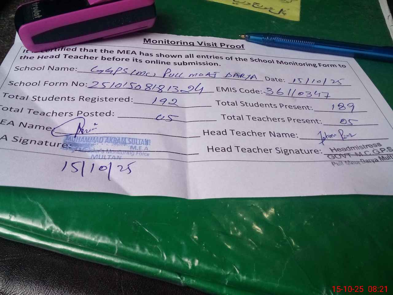 | Attendance Register | Head Teacher | MEA with School | Visit Proof |