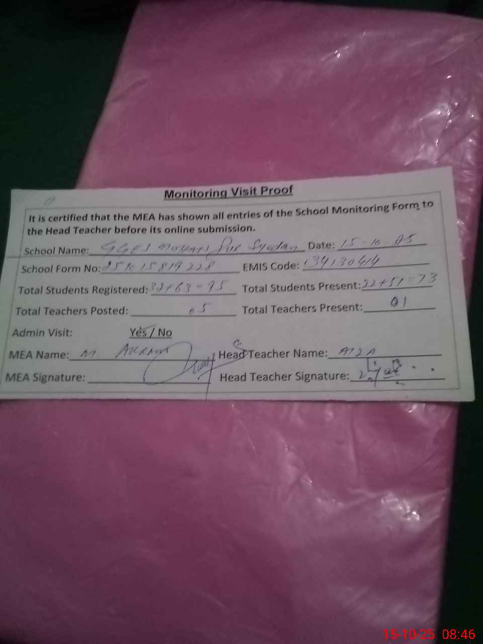 | Certified that this School was Inspected by the Undersigned MEA/DMO Today and the Information Stated Above is as Per Record. | |||||