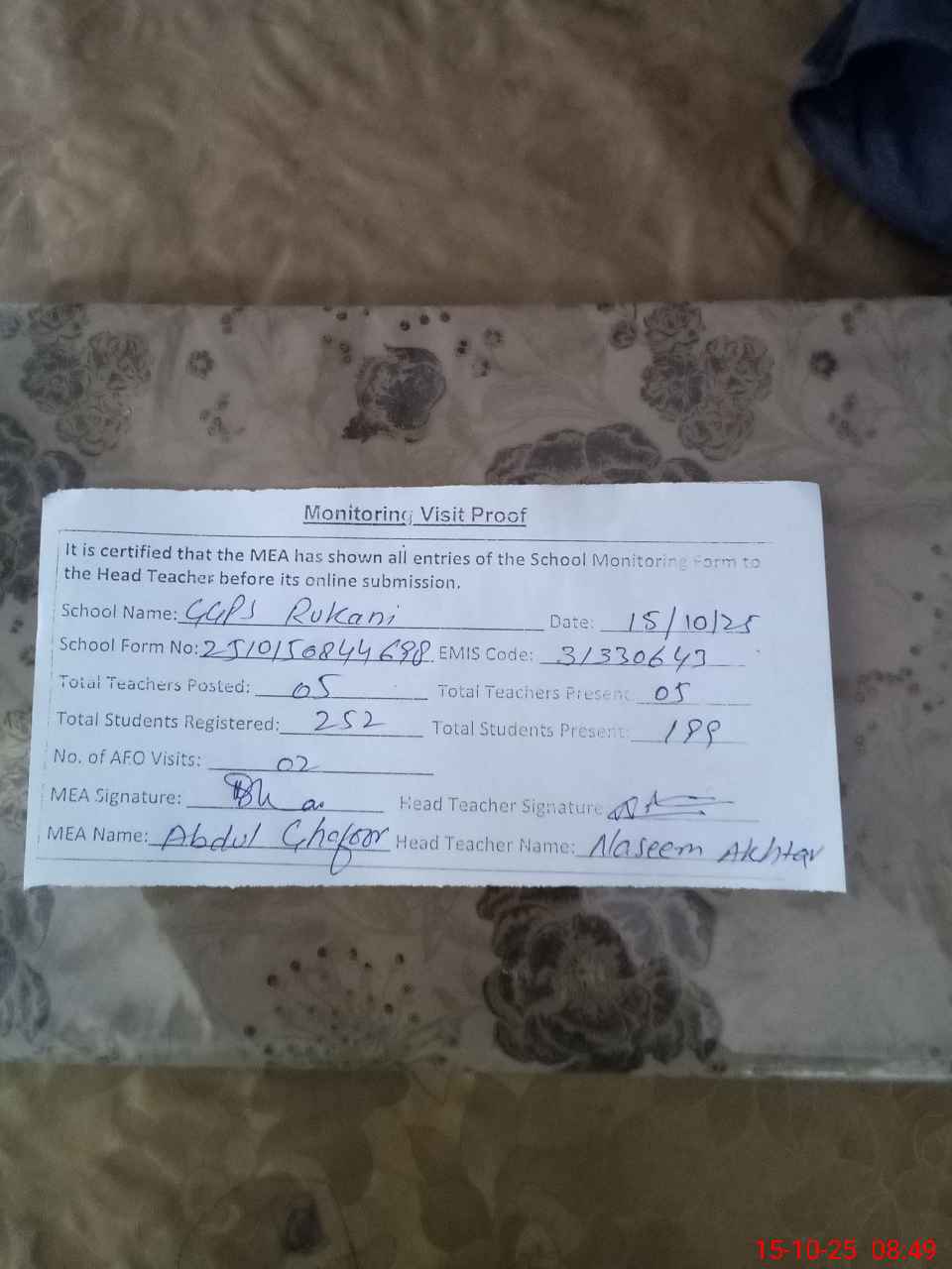 | Certified that this School was Inspected by the Undersigned MEA/DMO Today and the Information Stated Above is as Per Record. | |||||