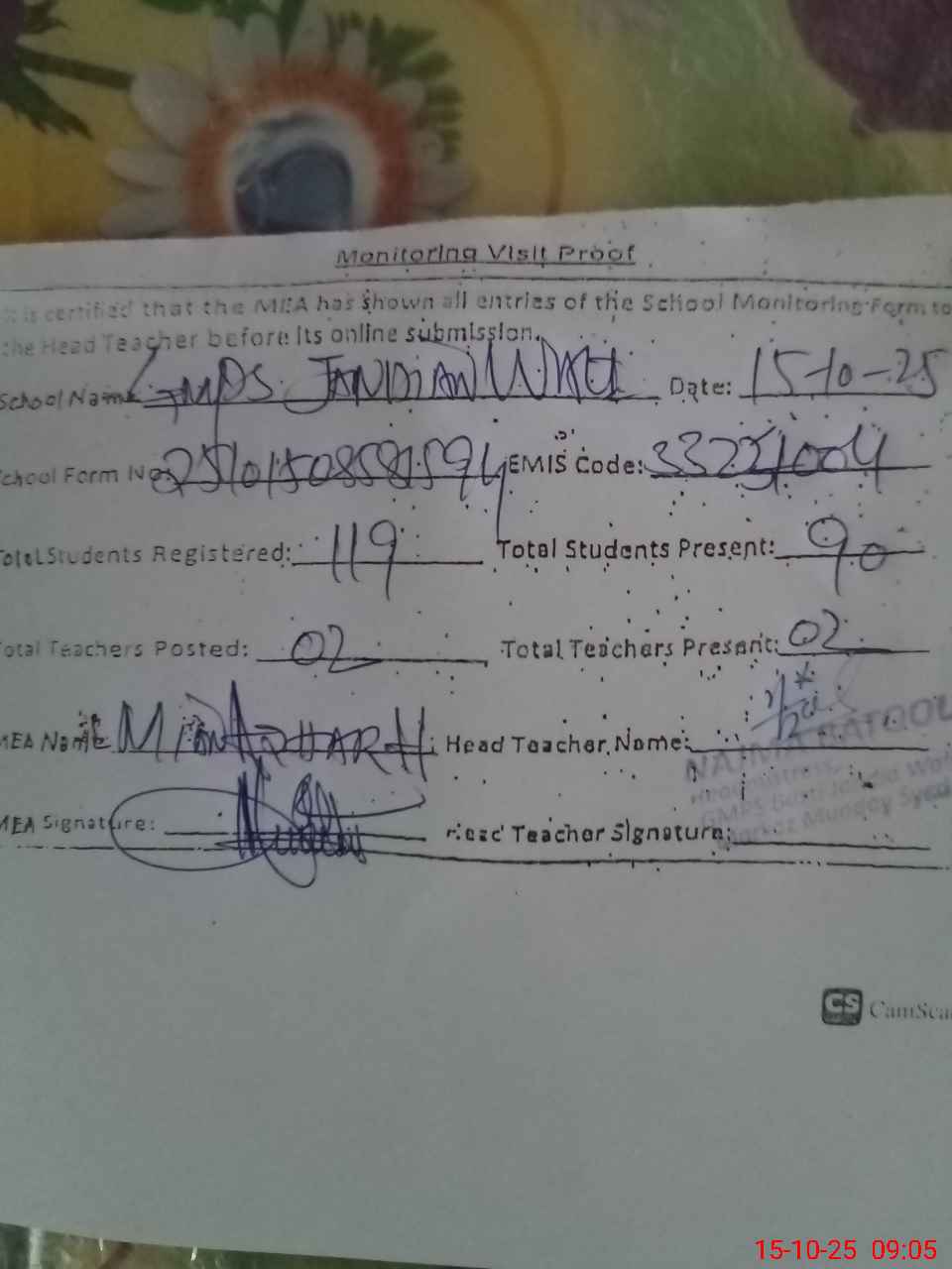 | Attendance Register | Head Teacher | MEA with School | Visit Proof |