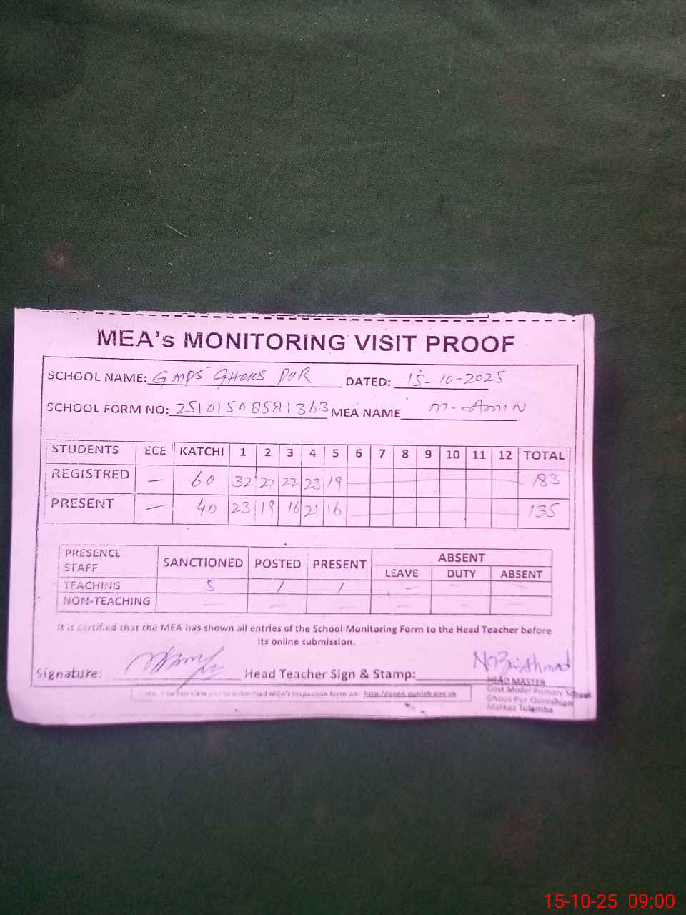 | EMIS Code: 36430393 | Name of School: GMPS GHOUS PUR, TULAMBA | |||