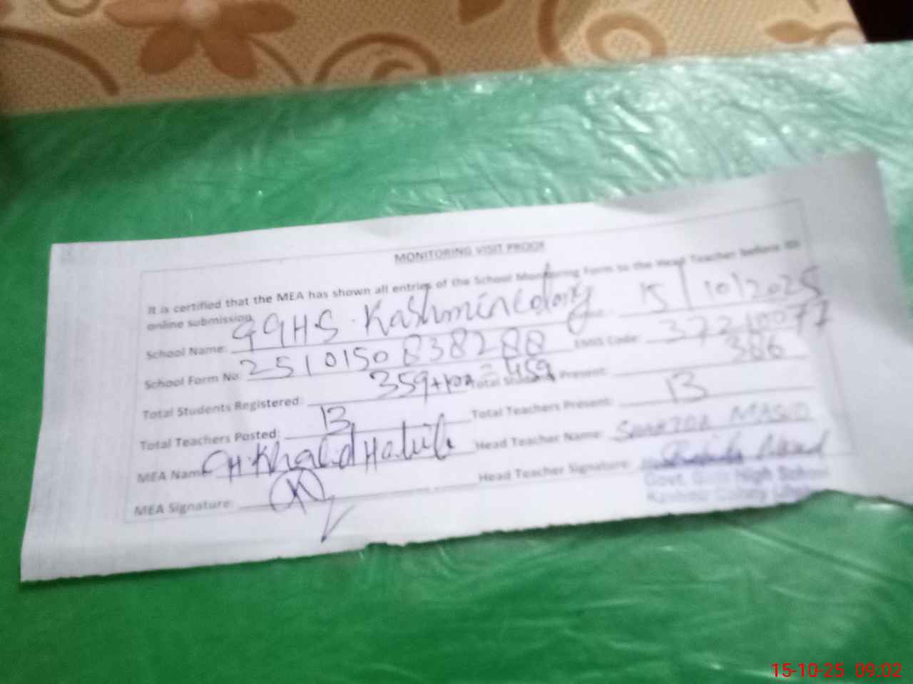 | Monitoring Date: 15-10-2025 | Start Time: 15-10-2025 08:38 AM | End Time: 15-10-2025 09:13 AM | Name of MEA: Kh**** ha**** | |