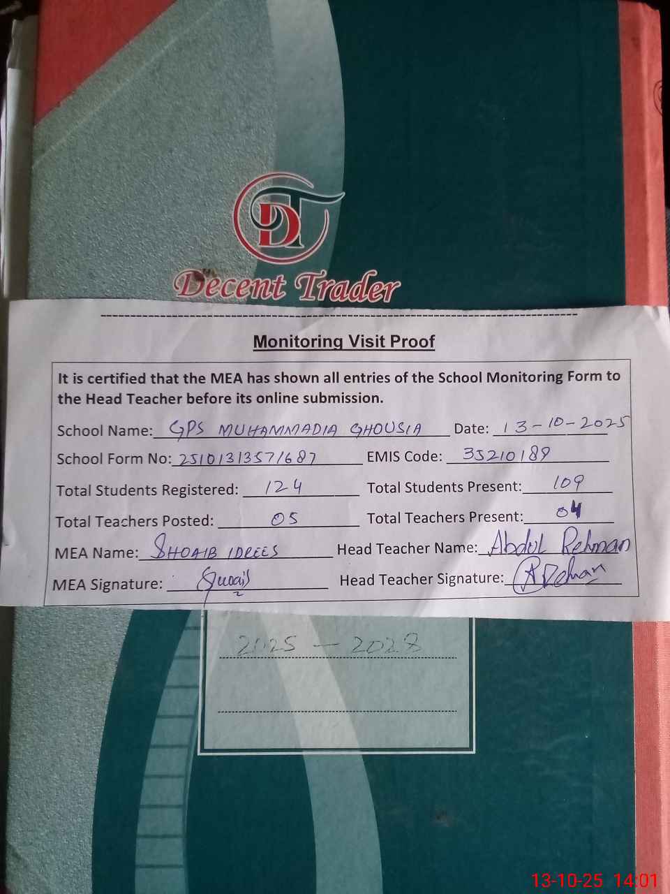 | EMIS Code: 35210189 | Name of School: GPS MUHAMMADDIA GHOUSIA | |||