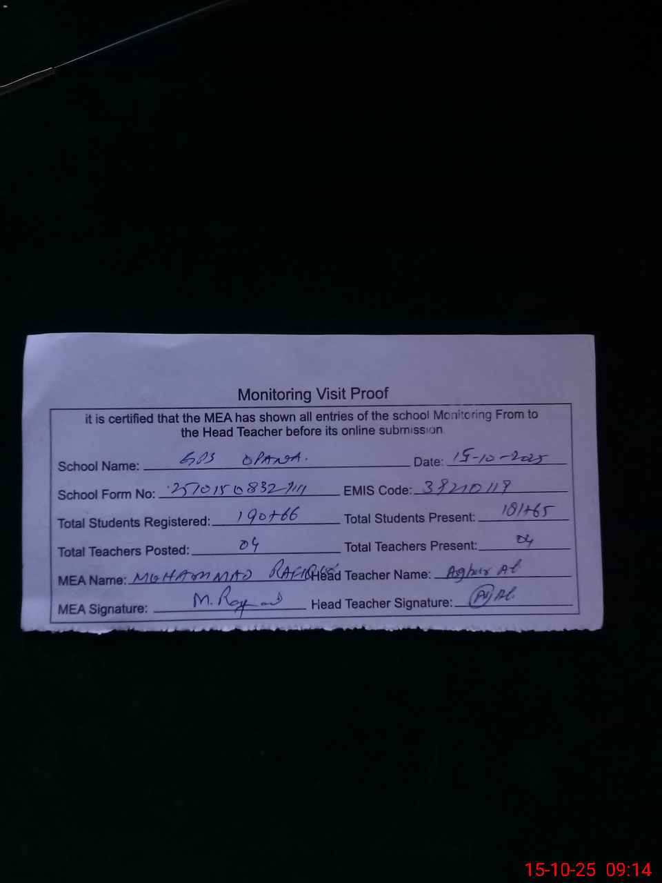 | Attendance Register | Head Teacher | MEA with School | Visit Proof |