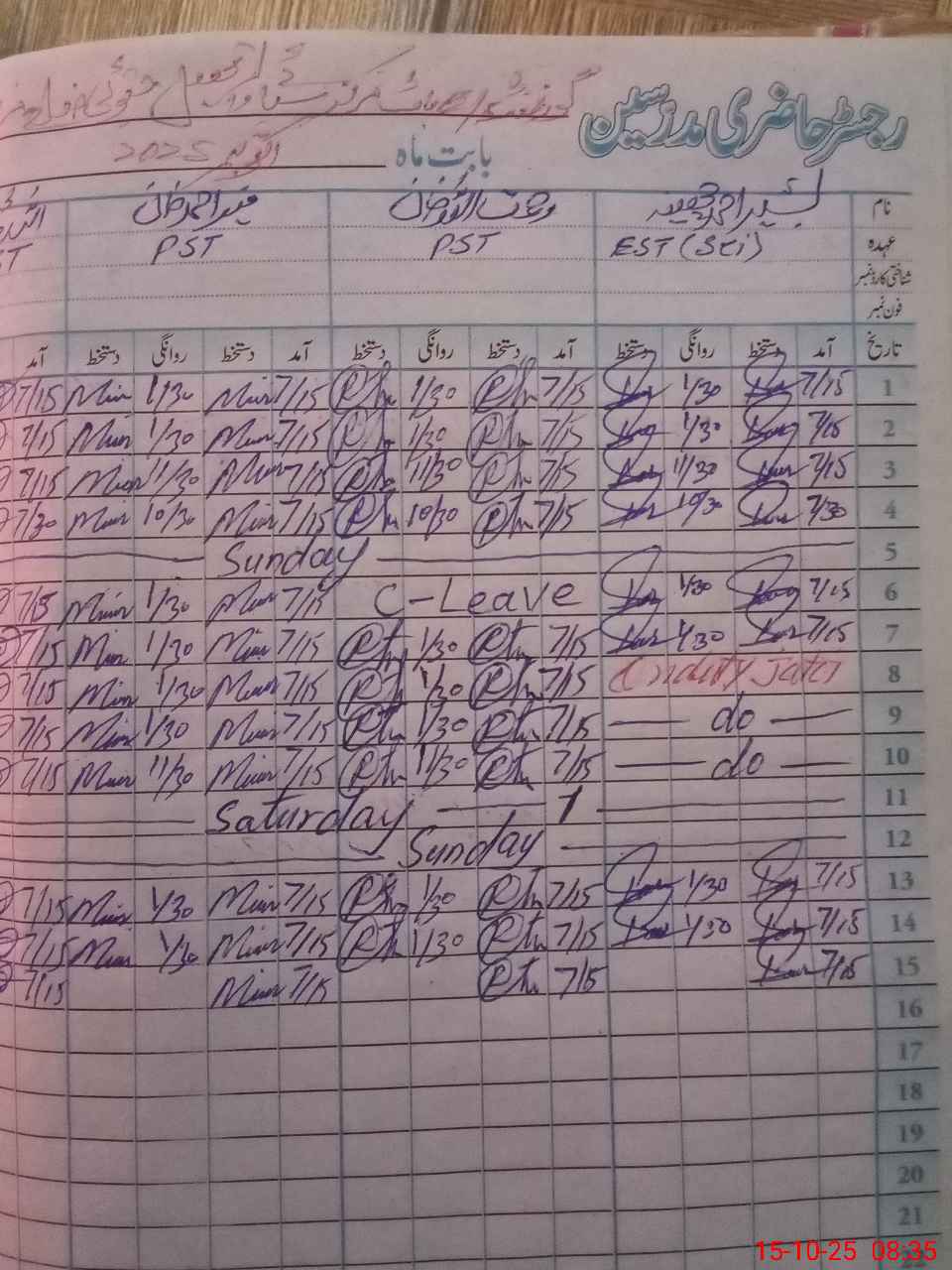 | CNIC | Full Name | Designation | R/C | Absence During Last Calender Month |