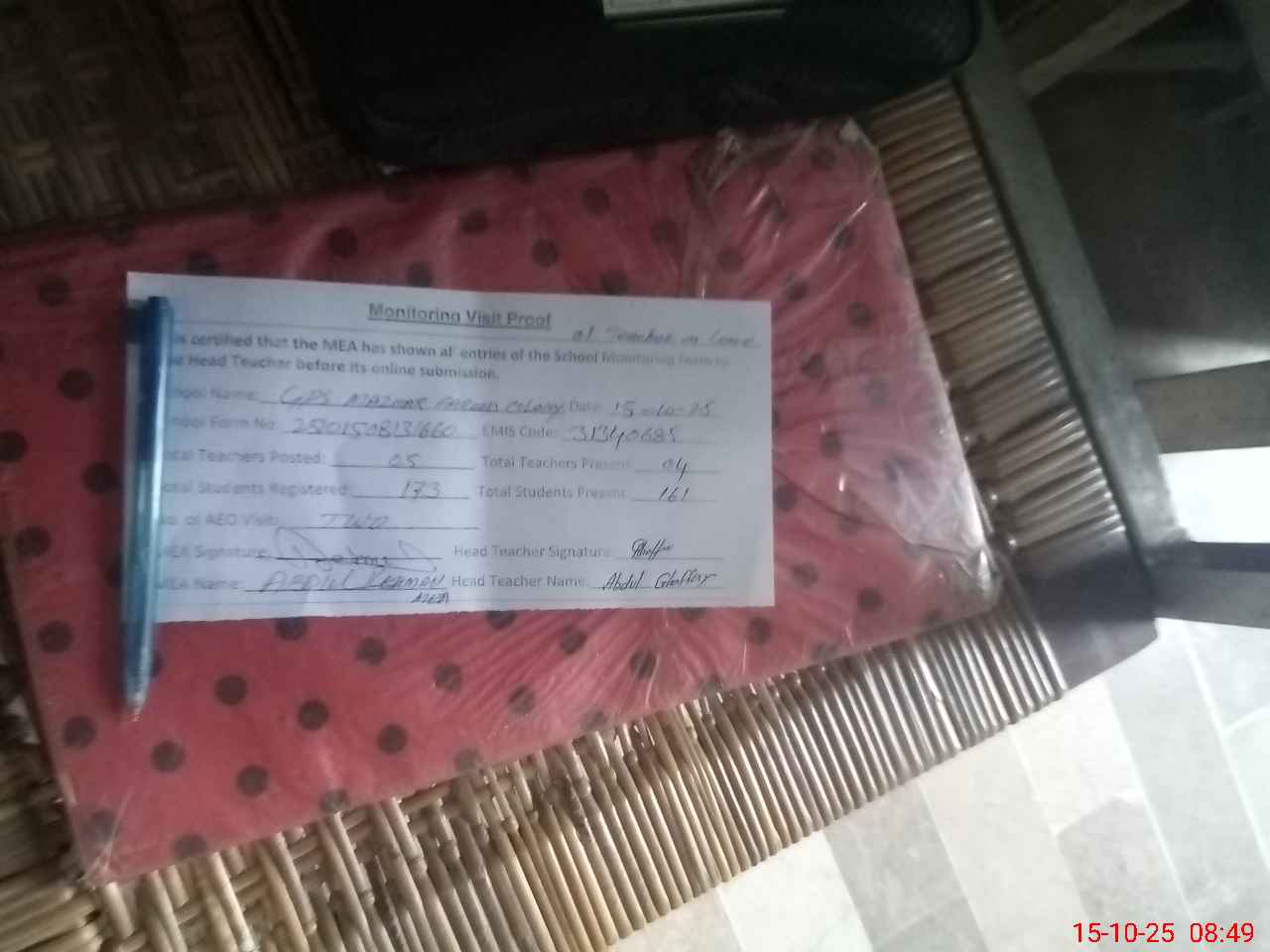 | Attendance Register | Head Teacher | MEA with School | Visit Proof |