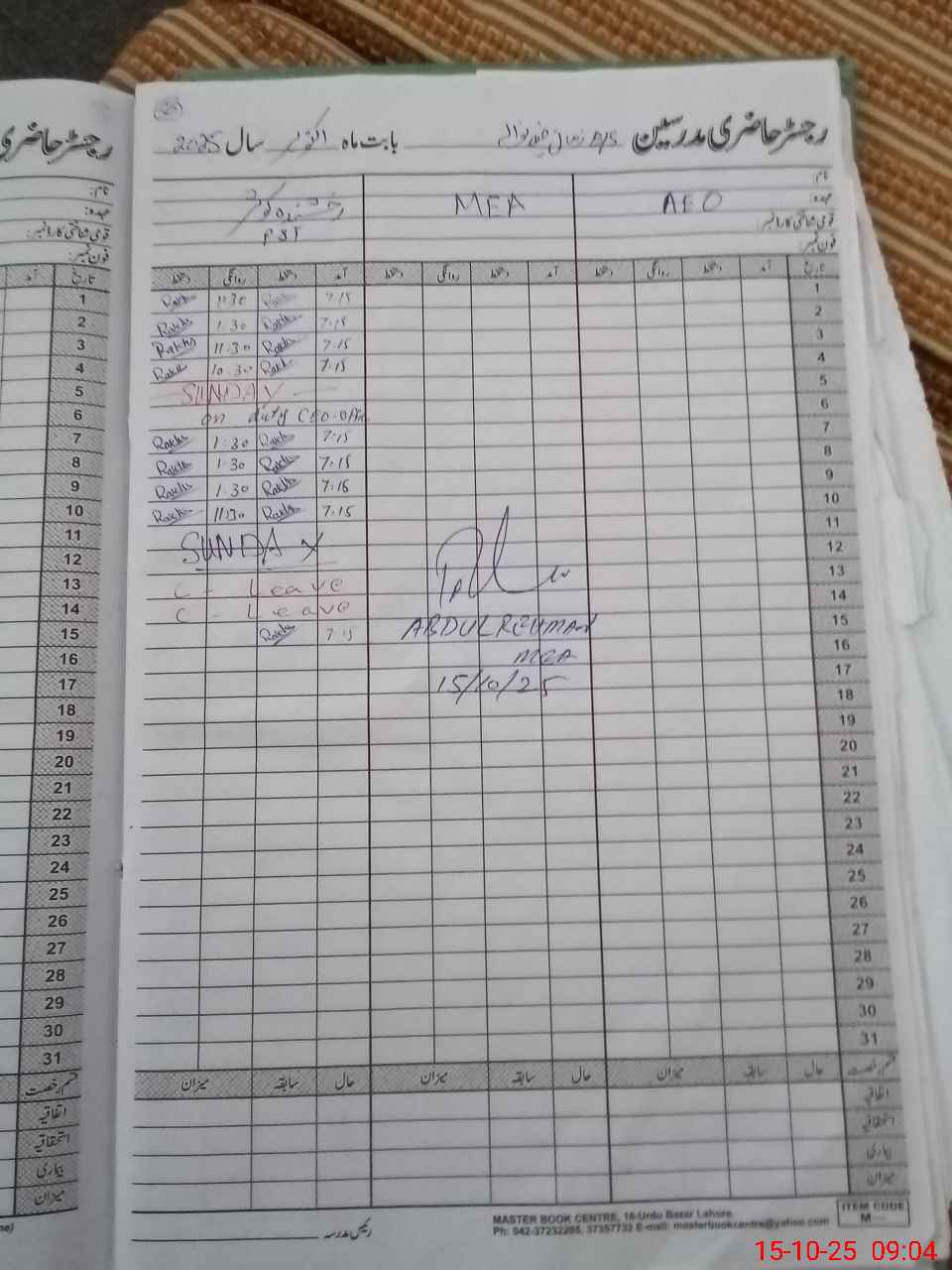 | CNIC | Full Name | Designation | R/C | Absence During Last Calender Month |