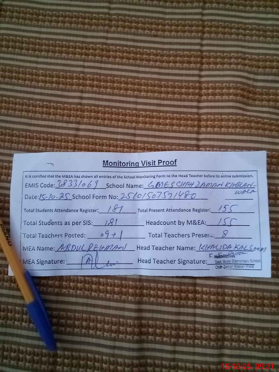 | Attendance Register | Head Teacher | MEA with School | Visit Proof |