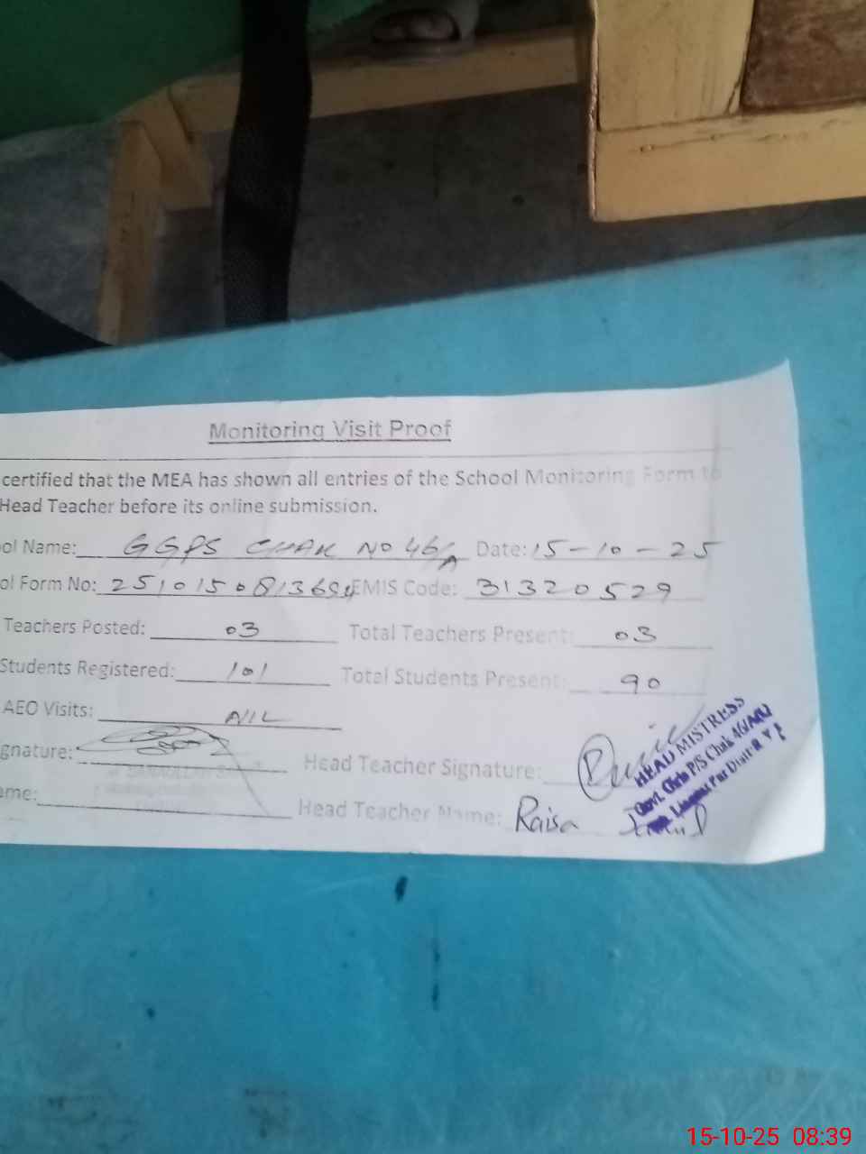 | Attendance Register | Head Teacher | MEA with School | Visit Proof |