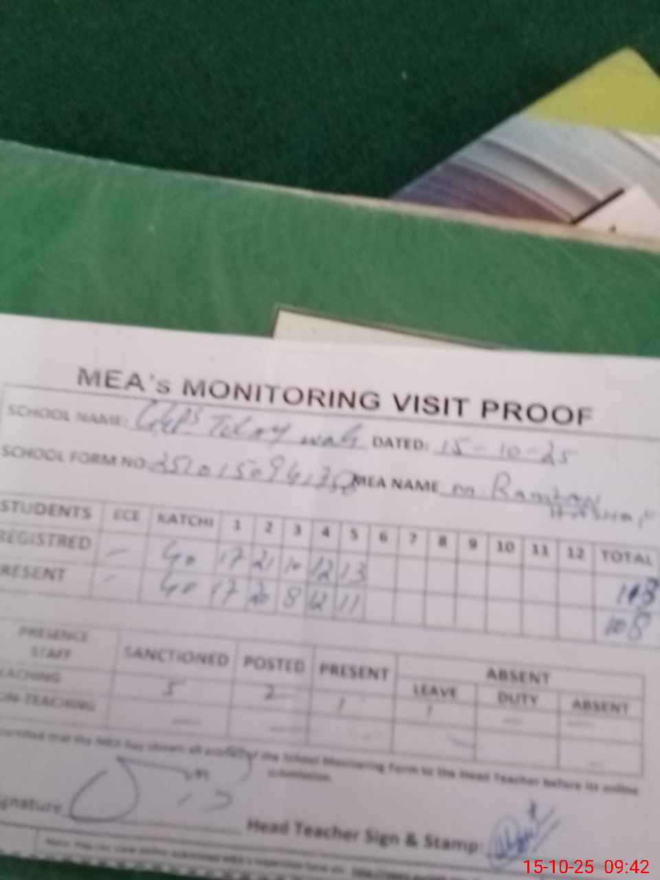 | Attendance Register | Head Teacher | MEA with School | Visit Proof |