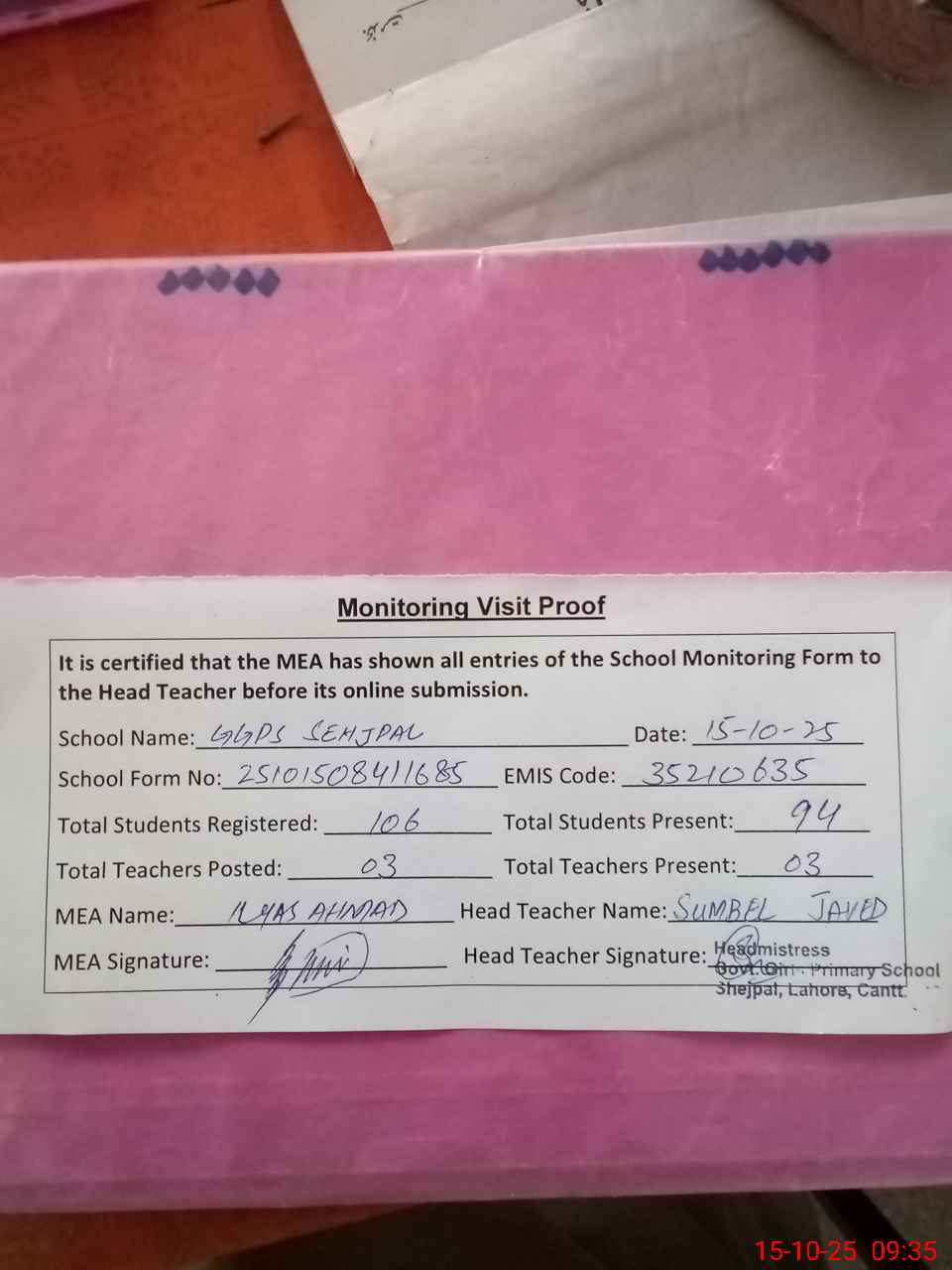 | Certified that this School was Inspected by the Undersigned MEA/DMO Today and the Information Stated Above is as Per Record. | |||||