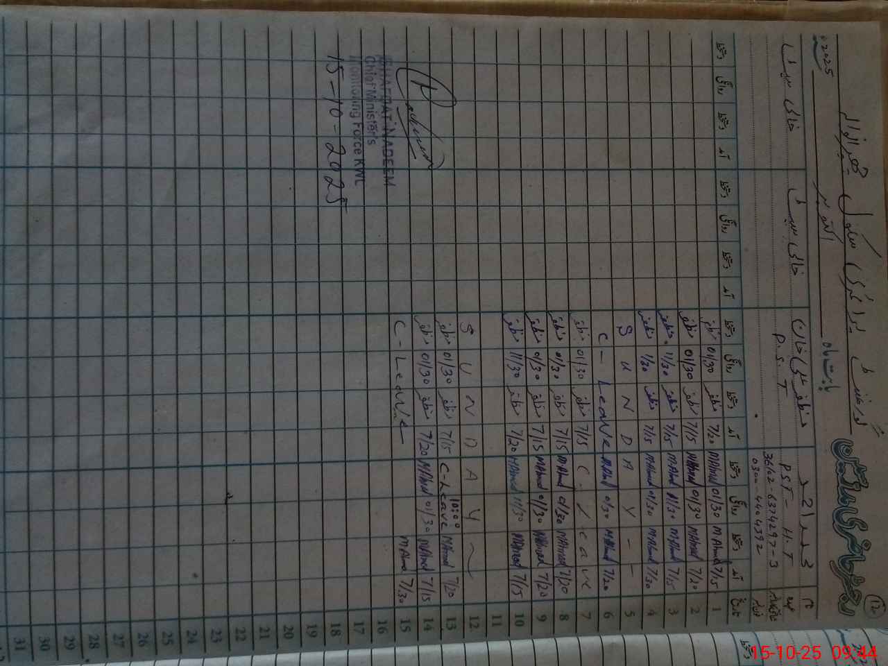 | CNIC | Full Name | Designation | R/C | Absence During Last Calender Month |