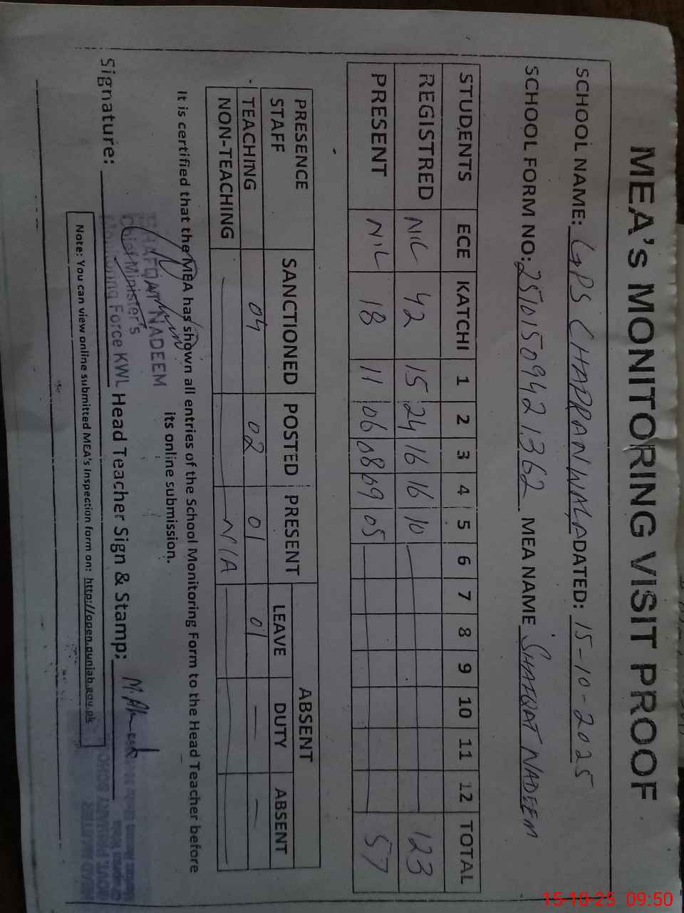 | Attendance Register | Head Teacher | MEA with School | Visit Proof |