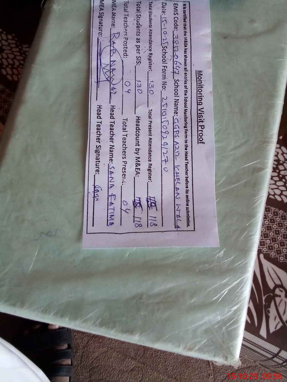 | Attendance Register | Head Teacher | MEA with School | Visit Proof |