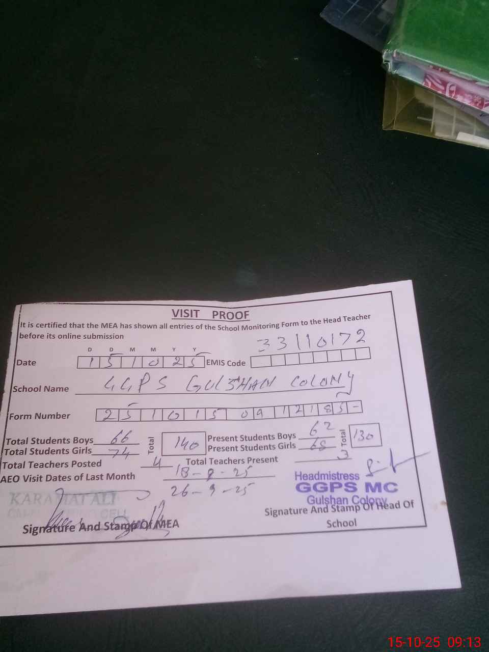 | EMIS Code: 33110172 | Name of School: GGPS MC GULSHEN COLONY | |||